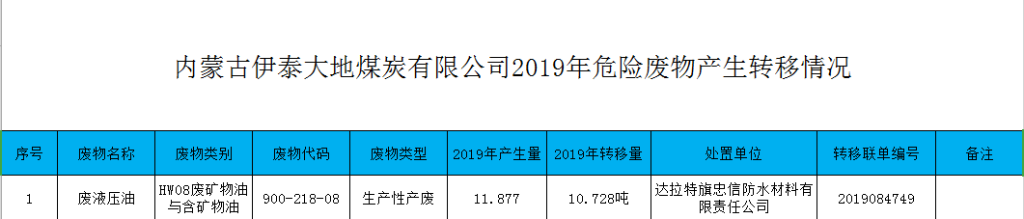 内蒙古伊泰大地煤炭有限公司2019年危险废物产生转移情况 <span>发布时间:2020-08-06</span> | <span class="views">关注:<b id="viewCountId">4144</b></span> | <a href="javascript:void(0)" class="print"><i class="ion"></i></a> 大地精煤矿2019年危废转移联单.pdf 返回列表 上一条 下一条