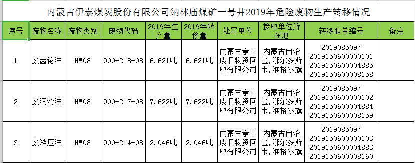 内蒙古伊泰煤炭股份有限公司纳林庙煤矿一号井2019年危险废物生产转移情况 <span>发布时间:2020-09-03</span> | <span class="views">关注:<b id="viewCountId">9889</b></span> | <a href="javascript:void(0)" class="print"><i class="ion"></i></a> 转移联单_2019150600000102.pdf转移联单_2019150600000101.pdf转移联单_2019150600000103.pdf转移联单_2019150600004883.pdf转移联单_2019150600004884.pdf转移联单_2019150600004885.pdf转移联单_2019150600008158.pdf转移联单_2019150600008159.pdf转移联单_2019150600008160.pdf转移联单_2019085097.jpg 返回列表 上一条 下一条