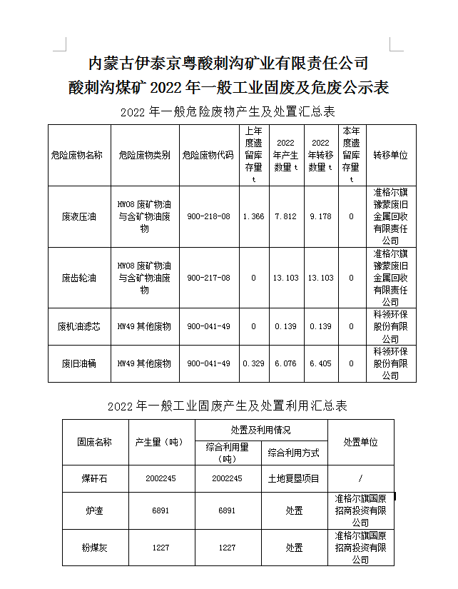 内蒙古伊泰京粤酸刺沟矿业有限责任公司2022年一般工业固废及危废公示表 <span>发布时间:2023-06-20</span> | <span class="views">关注:<b id="viewCountId">442</b></span> | <a href="javascript:void(0)" class="print"><i class="ion"></i></a> 返回列表 上一条 下一条