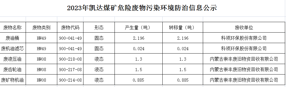 2023年凯达煤矿危险废物污染环境防治信息公示 <span>发布时间:2023-06-21</span> | <span class="views">关注:<b id="viewCountId">385</b></span> | <a href="javascript:void(0)" class="print"><i class="ion"></i></a> 凯达煤矿煤矿固体废物公示信息.xls(1).xls 返回列表 上一条 下一条