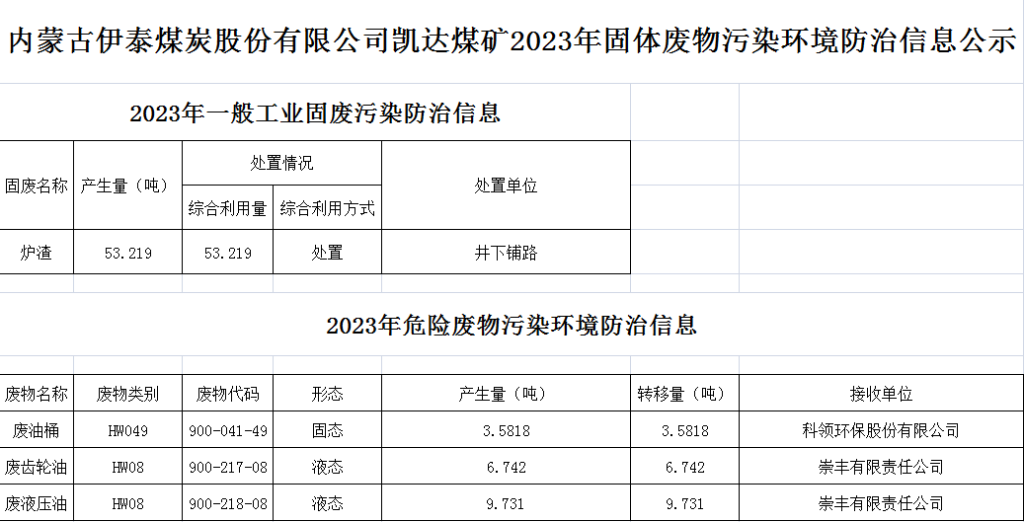 内蒙古伊泰煤炭股份有限公司凯达煤矿2023年固体废物污染环境防治信息公示 <span>发布时间:2024-01-11</span> | <span class="views">关注:<b id="viewCountId">299</b></span> | <a href="javascript:void(0)" class="print"><i class="ion"></i></a> 凯达煤矿煤矿固体废物公示信息.xls (2).xls 返回列表 上一条 下一条